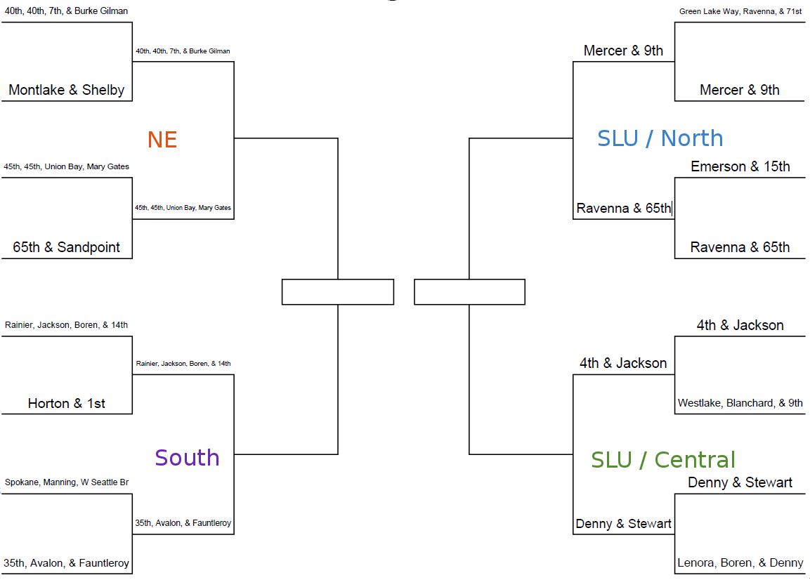 The intersections that advanced out of South / West Seattle also included multiple streets. Rainier, Jackson, Boren, and 14th advanced in a resounding win along with the multi-intersection triangle of 35th, Avalon, and Fauntleroy.