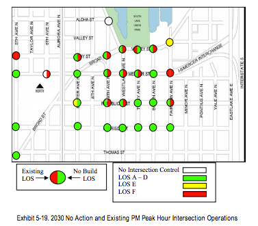 Comparisons are already being drawn between the new Alaskan Way, and the “new” Mercer Street, and the comparison is apt on many levels. First, the head engineer at SDOT, Angela Brady, is the same on both projects. And we can look back and see the arguments used in the Mercer Street FEIS toward the Level of Service standards. This chart shows LoS as “F” in a no-build alternative along Mercer by 2030, and green (which could mean anything from A to D) in the alternative we recently completed–the same design that became swamped with traffic almost immediately and is now only two seconds faster than before.