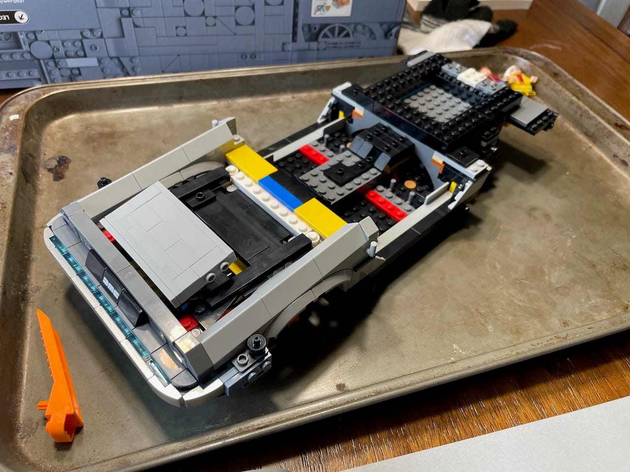 The Lego model I have underway right now is a 1981 DeLorean DMC-12 uniquely modified with a flux capacitor and 1.21 gigawatt Mr. Fusion reactor. I just finished Bag #5, where we assembled the front wheel wells and slapped the DMC logo over the silver bumper. It cased in the mechanism that flips the wheels for hover mode.