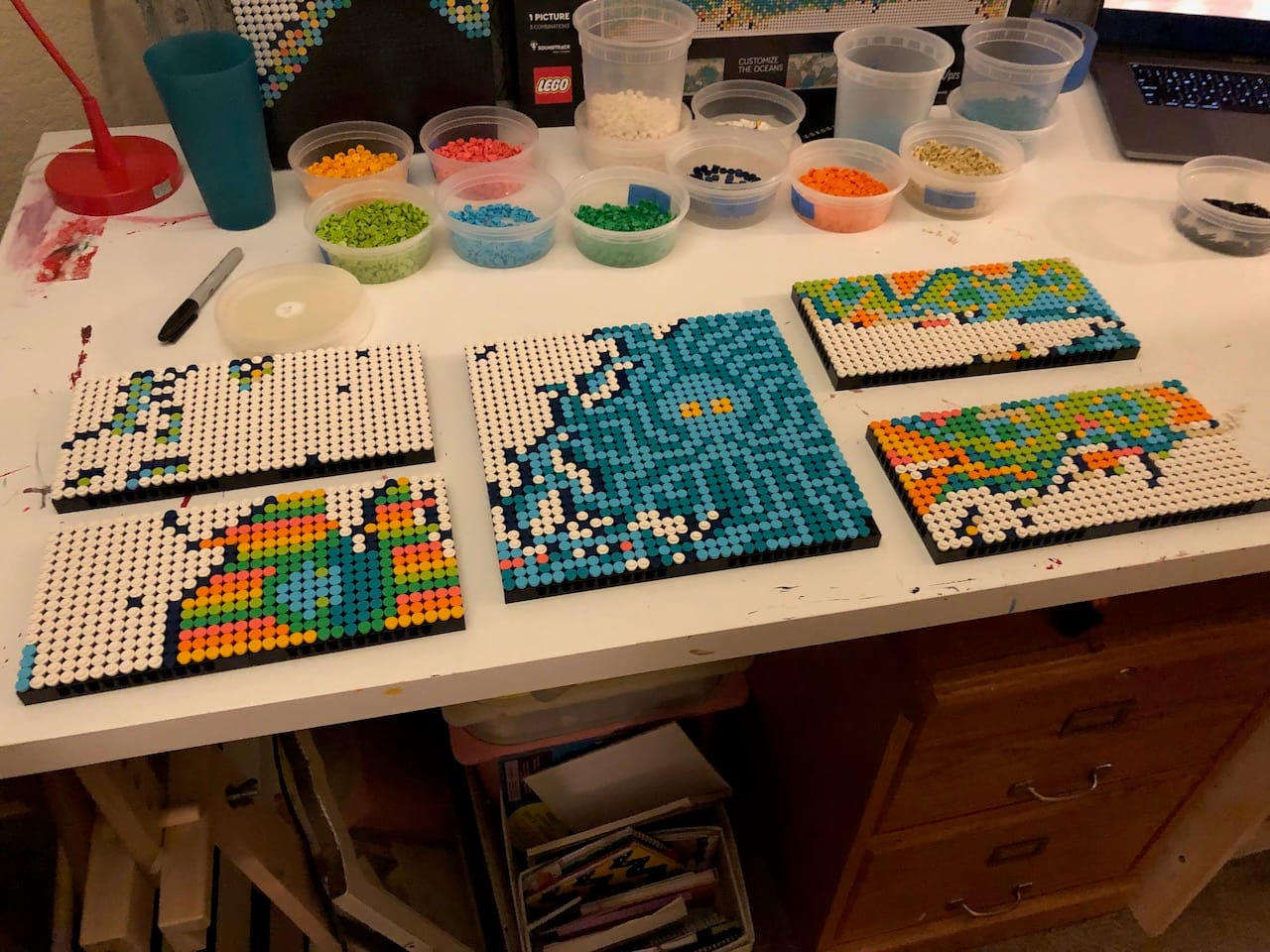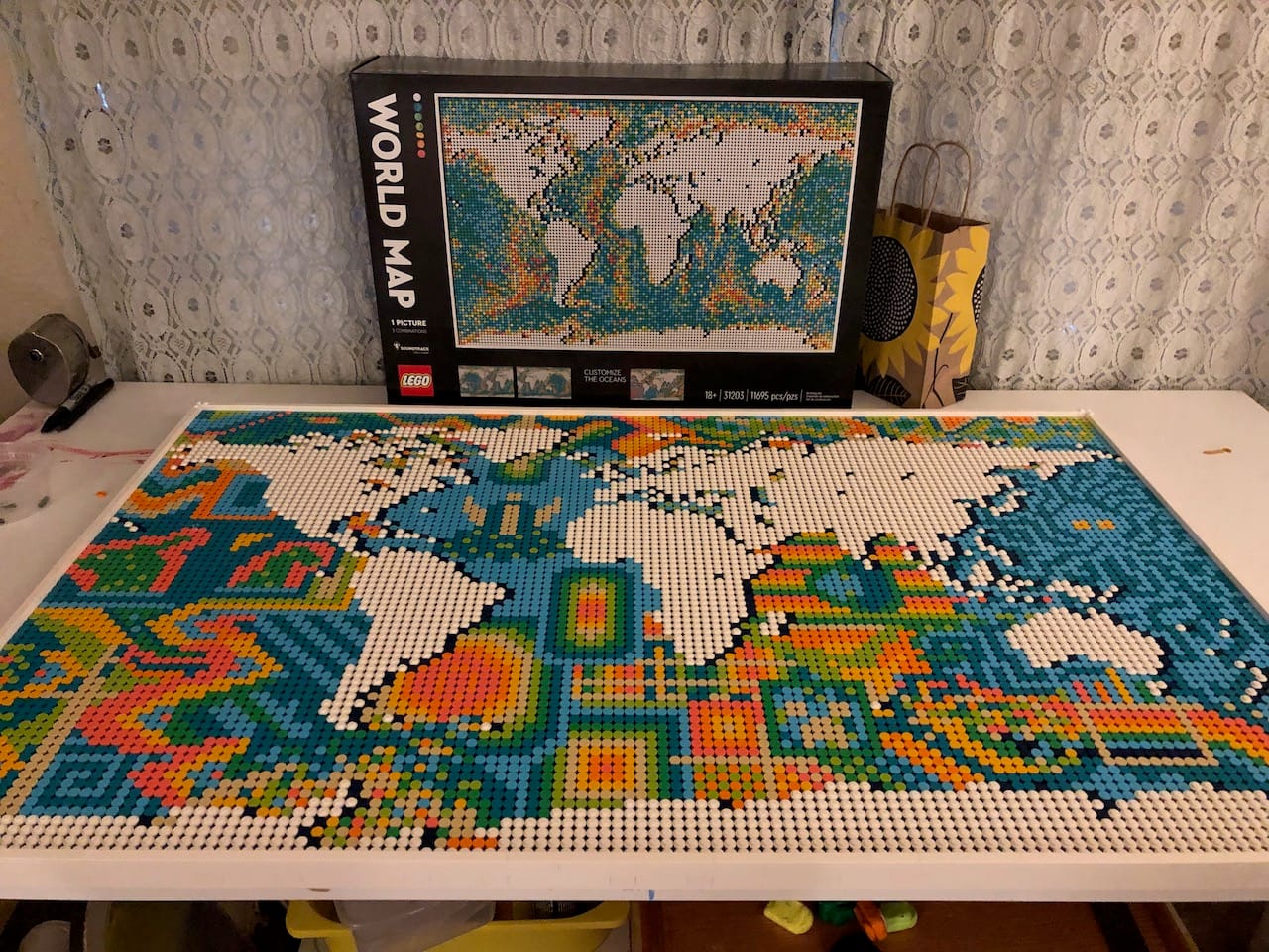 We did the Lego World Map a few years back while sheltering from the heat dome in our one air conditioned room. While it went over 100 degrees in wildly unprepared Seattle, we turned on a movie and put 11,000 little dots on a 20 inch by 40 inch mosaic. The instructions included panel-by-panel instructions for making a colorful relief map of the sea floor. We opted for a more free-form look at the oceans, full of monsters and patterns. To date, it is the largest Lego set available, and a perfectly reasonable antidote to catastrophic climate events.