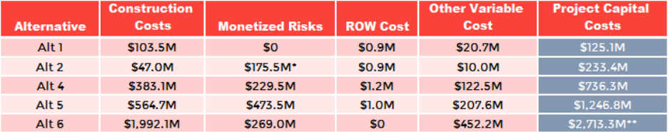 To calculate ROM capital costs, WSP summed up construction costs for initial capital investments, monetized risk, right-of-way, and other variables. These early estimates are intended to capture the full spectrum of potential costs for each alternative, appropriate allowances for easements and property acquisition are included in the costs. With everything factored in, costs come out as one might expect with shoring and repair the cheapest and replace becoming more expensive as the alternatives become more involved.