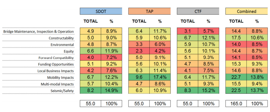 To evaluate the five remaining options WSP had the City, the Technical Advisory Panel (TAP), and Community Task Force (CTF) identify and weigh 10 performance attributes. After those weighted scores were averaged across the three entities, Mobility Impacts and Seismic/Safety came out as the most important criteria that the alternatives were evaluated on. Constructability comes at a distant third. The remain criteria, Bridge Maintenance, Inspection, and Operation, Environmental, Equity, Forward Compatibility, Funding Opportunities, Business and Workplace Impacts, and Multi-modal Impacts, received similar and the least importance according to the combined rating.