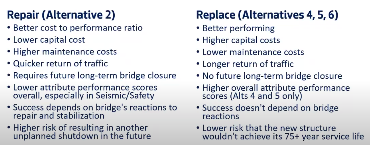 With all the base assumptions, alternative 2 (repair) and alternative 4 (superstructure replacement) emerge as close contenders for best life cycle value. Early on, repair does have better value for the initial capital costs. In its October 21st presentation to the Community Task Force, SDOT does acknowledge that these cost benefit ratios will change as they learn more about the rapid replace option, and more about the state of the bridge during the stabilization process. Positive news either would benefit the outlook on replace or repair, respectively. The agency ends their presentation with the following synopsis on the repair versus replace debate, with positive data for both.
