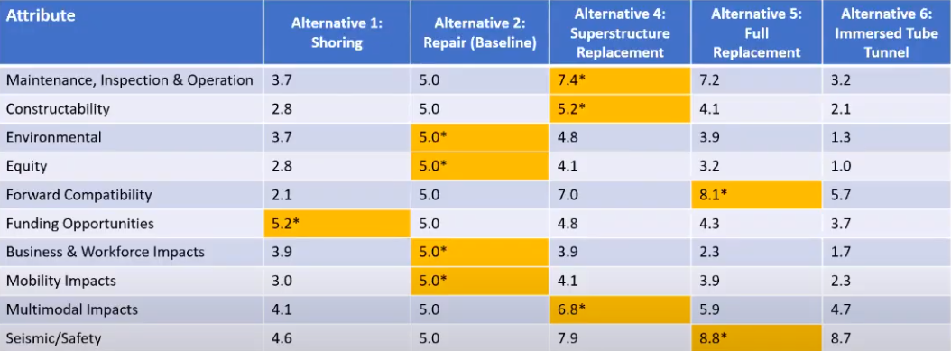 Identified and weighted, each performance attribute is broken down into measurable subcategories and each alternative is graded based on each of those measurables. For example, forward compatibility is broken down into future roadway configurations, and light rail accommodation feasibility. Replacement options here are preferred the most and graded the highest, as they could accommodate light rail. See the rest of the performance attributes broken down in Section 3 of the full CBA.