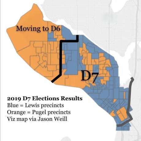 Relatedly, Crown Hill and North Greenwood are leaving D6 and joining North Seattle’s D5. Pioneer Square is leaving D7 and joining West Seattle’s D1. A chunk of South Lake Union that had been with U District in D3 is joining D7, uniting the neighborhoods south of the Montlake Cut.