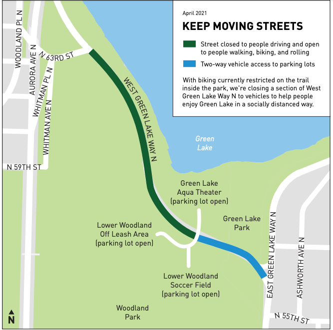 Until recently, SDOT had opened nearly the entire southwest quadrant of the street circling Green Lake. But late this winter one of the travel lanes allowed vehicles again, to provide access to the parking lots along the street, to the off-leash dog park in particular. After reports of some people driving cars in the wrong lane, this configuration will be reverted back on most of the street, but the segment between the parking lots and East Green Lake Way will be available for people driving to use. This change is expected any day now.