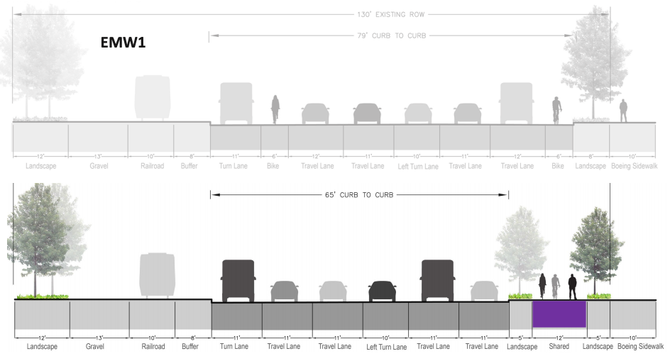 The design will use the space currently utilized by those painted bike lanes and consolidate them into the trail along the north side of the street, on the other side of Marginal from the railroad tracks. Some of the travel lanes will get trimmed down from 12- to 11-feet. The sidewalk on this side of Marginal is minimal at best, partially missing at worst. This will be a truly dramatic improvement on a neglected corridor.