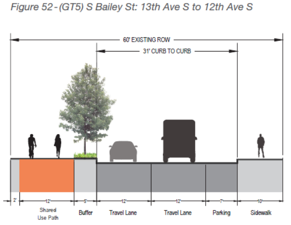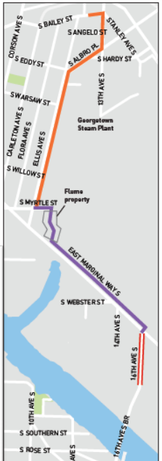 The trail’s northern segment in Georgetown will start on S Bailey Street, between 12th Avenue S and 13th Avenue S, near Georgetown’s Old City Hall building. 12th Avenue is a relatively low traffic street that would connect people directly to and from the Airport Way business district, but the trail won’t provide that connection directly, which would have been great to see.