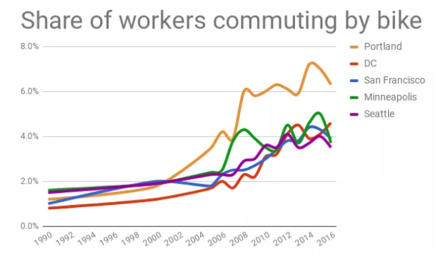 Bike Commuting Levelling Off: Streetsblog broke down the trends in bicycling mode share. Rates are flat or slipping in many cities across the nation including Seattle and Portland, but “Pittsburgh, Washington, Detroit, and Cleveland posted all-time highs.” One explanation, Pittsburgh recently upgrade its infrastructure with more bike lanes.