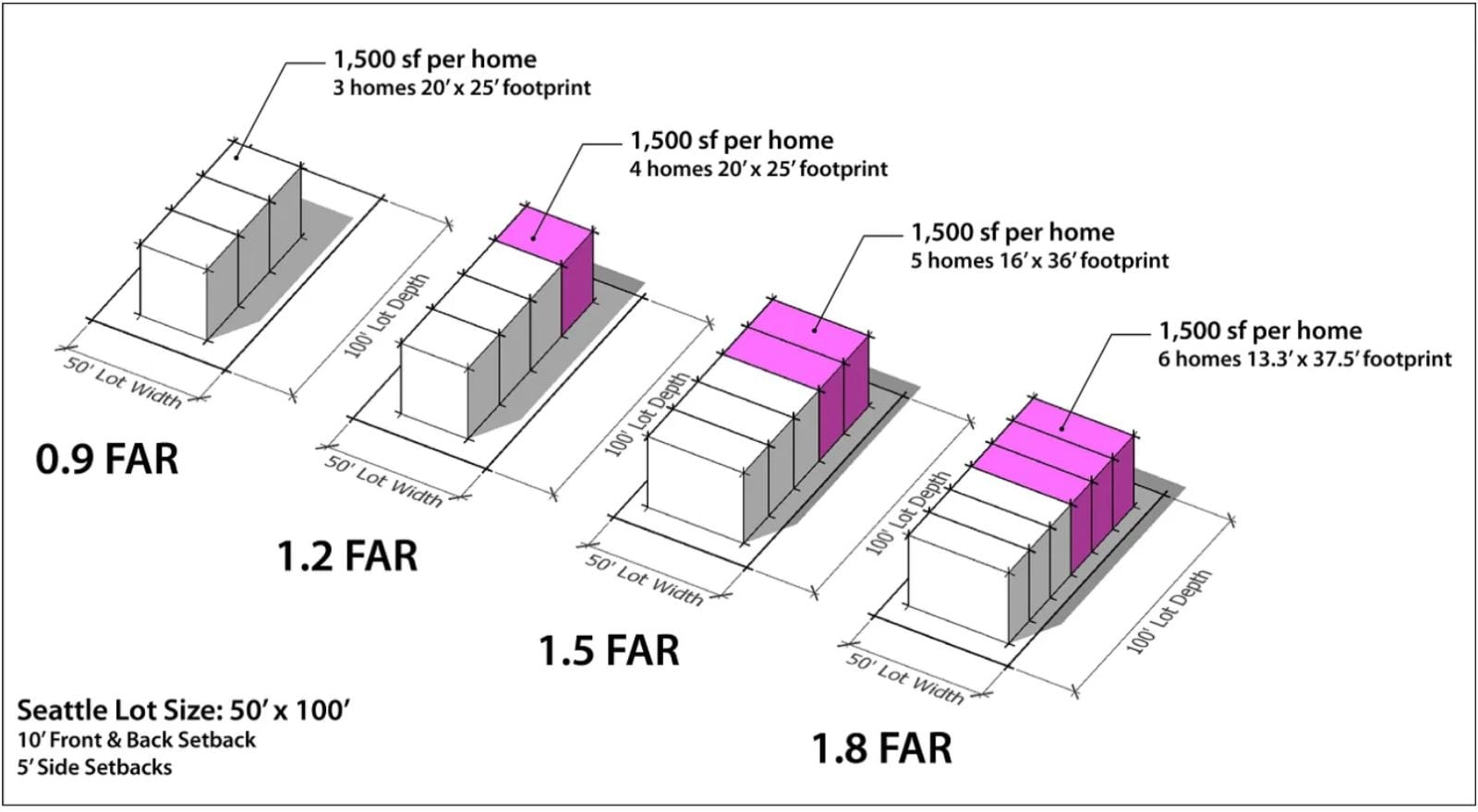 A broad coalition of more than 50 organizations (including The Urbanist) sent a letter to the City of Seattle urging them to improve the plan. Crosscut‘s Josh Cohen noted the coalition includes “political heavy hitters” like the Seattle Metropolitan Chamber of Commerce, real estate groups, nonprofit builders, and advocacy groups — the MLK County Labor Council also voted to endorse the letter this week. First on the coalition’s list of demands: “Allow for More Family-Sized Homes in Middle Housing: Increase the Floor Area Ratio (FAR) for fourplexes and sixplexes, to make it possible to build more family-sized homes.”
