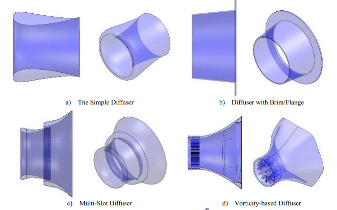 Wind turbines can be modified to have a diffuser that can funnel wind to the turbine, reducing the effect of turbulence and lower wind speeds. Both horizontal and vertical turbines can be augmented with a diffuser.