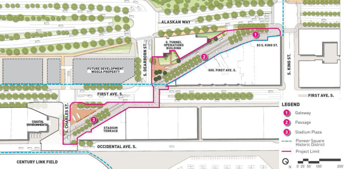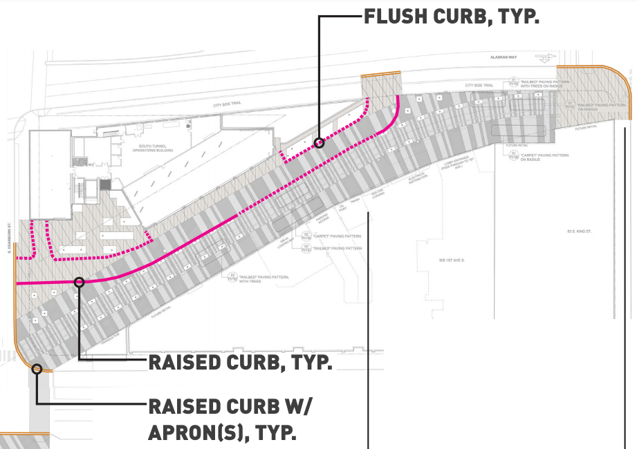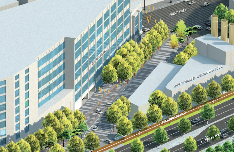 This aspect of the waterfront project is actually going to be pretty transformative compared to what existed before. Railroad Way is a street that cuts across the street grid, and used to follow the path of the now-demolished Alaskan Way Viaduct as it veered away from the waterfront toward the stadium district heading south. With the completion of the new Alaskan Way, Railroad Way will be transitioned from being primarily a corridor for vehicles to a pedestrian-oriented corridor between the stadium district and the new waterfront. That doesn’t mean Railroad Way is turning into a full pedestrian street. WSDOT is also constructing a new addition to its South Tunnel Operations Building, an equipment garage that will be accessed via Railroad Way. The street will also remain the access point for several garages for buildings along the adjacent streets.