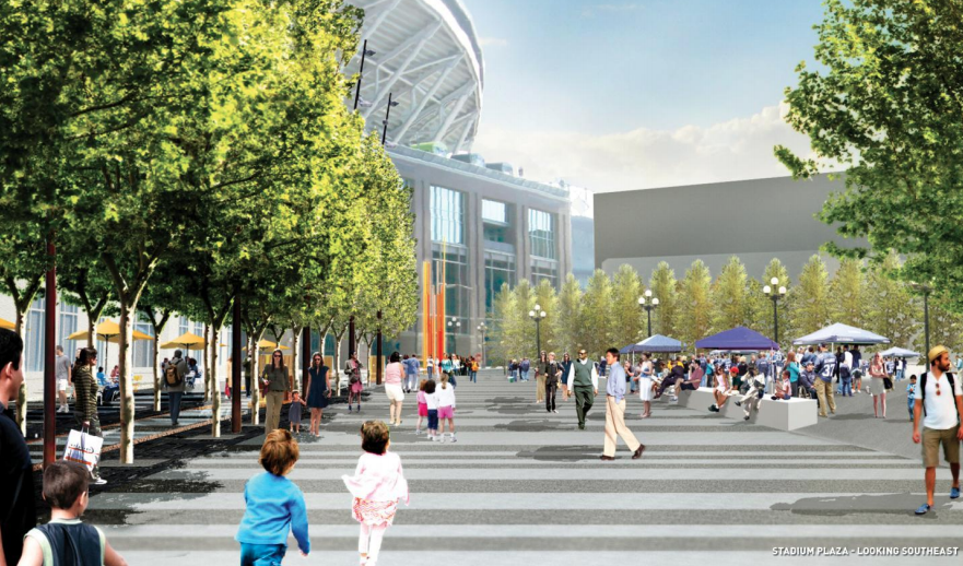 Currently this area of Railroad Way is used as parking for stadium events, but it will be revamped into pedestrian-first space that people will actually want to utilize — that’s the plan, anyway.
