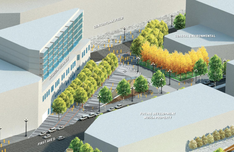 South of 1st Avenue S, the pedestrian corridor continues to Occidental Avenue S and the front door of Lumen Field. This space is intended to act more as a front plaza for the football stadium, providing a space for people to gather after events let out and to hold stadium-adjacent events themselves. There’s only one small segment of this block that provides vehicle access to a garage.
