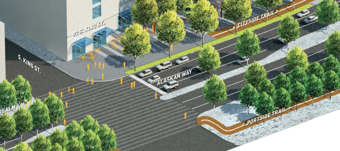 Another trail, dubbed the Cityside Trail, is being built that will also connect at S King Street but run along the other side of Alaskan Way south to S Atlantic Street.
