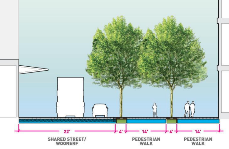 Pedestrian space will be delineated from the vehicle driveway portion of the roadway primarily using trees and pavement types. In a nod to the railroad-focused history of the street (all of Alaskan Way used to be called Railroad Way and was a major confluence of rail lines), the paving along the street will be created to mimic a railroad track bed. The primary pedestrian corridor will run between two rows of trees set where the “tracks” in the faux railway are. But the space between the buildings along the east side of the corridor and the trees will also be pedestrian space, providing a large amount of space to walk and roll.