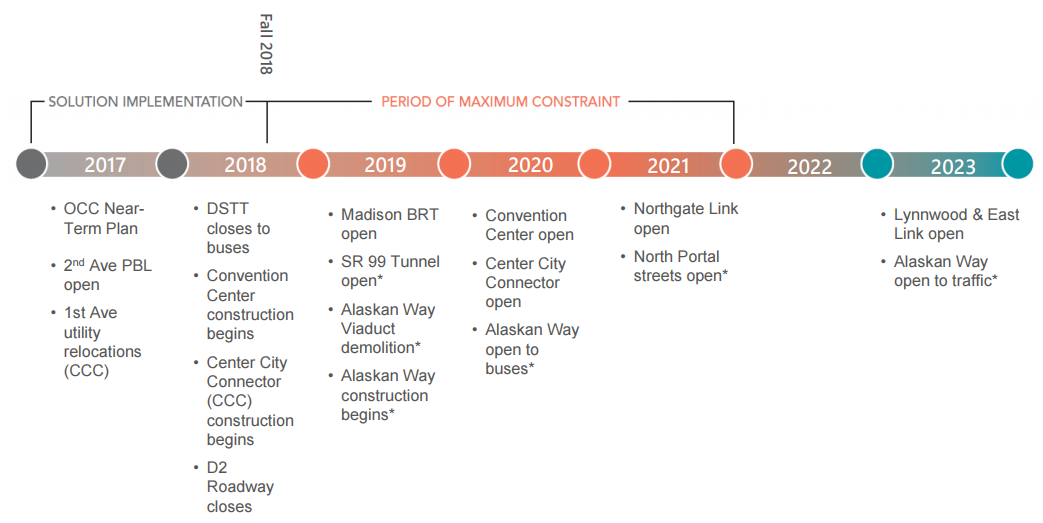 The WSCC has argued that the buses will be coming out of the transit tunnel anyway due to the demands of more frequent light rail service as Link expands to Northgate by 2021. That does appear to be Sound Transit’s plan, but there certainly is a cost in doing so a few years earlier and rushing the time transit agencies have to vet and carry out this massive undertaking. Will the transit agencies be able to execute an ambitious plan when they have only 18 months to take the project from early concepts to 100% design?