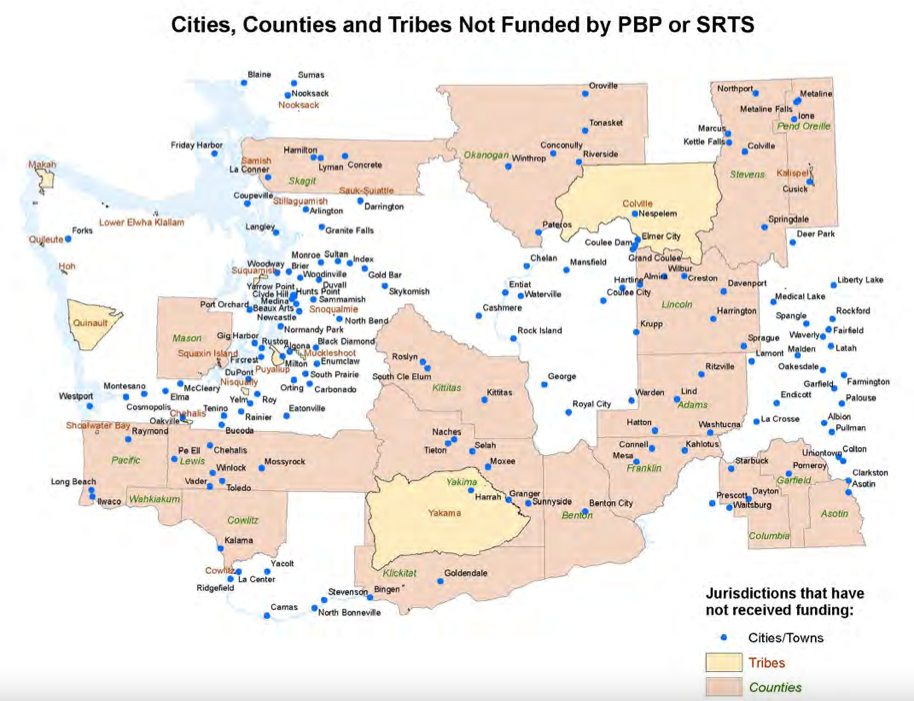 Rural areas and smaller communities were less likely to have these road safety projects completed because of the competitive nature of the application process. The bulk of state funding to bike and pedestrian projects is flowing in the Puget Sound Region, Spokane, or Yakima, with far less in other corners of the state.