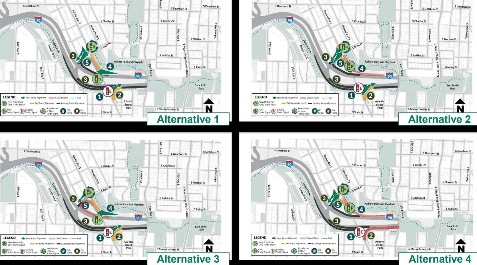 The preferred option WSDOT is now advancing would fully eliminate the northbound ramp from westbound I-90, an interchange that flies directly over a corner of Judkins Park itself. Northbound drivers would instead utilize the same ramp used by southbound drivers on the other side of Rainier, with that intersection either being modified into a full traffic signal or a roundabout. The eastbound ramp onto I-90 from the south would be squared up like a normal city intersection.
