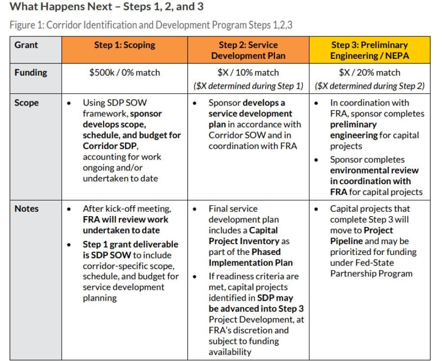 The Washington State Legislature approved $5 million in matching funds for the high-speed rail program. The FRA requires 10% local matching funds to advance the project through Step 2 of the FRA’s Corridor Identification and Development Program, which ultimately could make it competitive for construction grants that make the project a reality. The new award may be sufficient to complete the entirety of Step 2 of the process, though The Urbanist has reached out to an Inslee spokesperson to confirm this. Step 3 would be preliminary engineering and environmental review study work under the National Environmental Protection Act (NEPA), which requires a 20% local match.