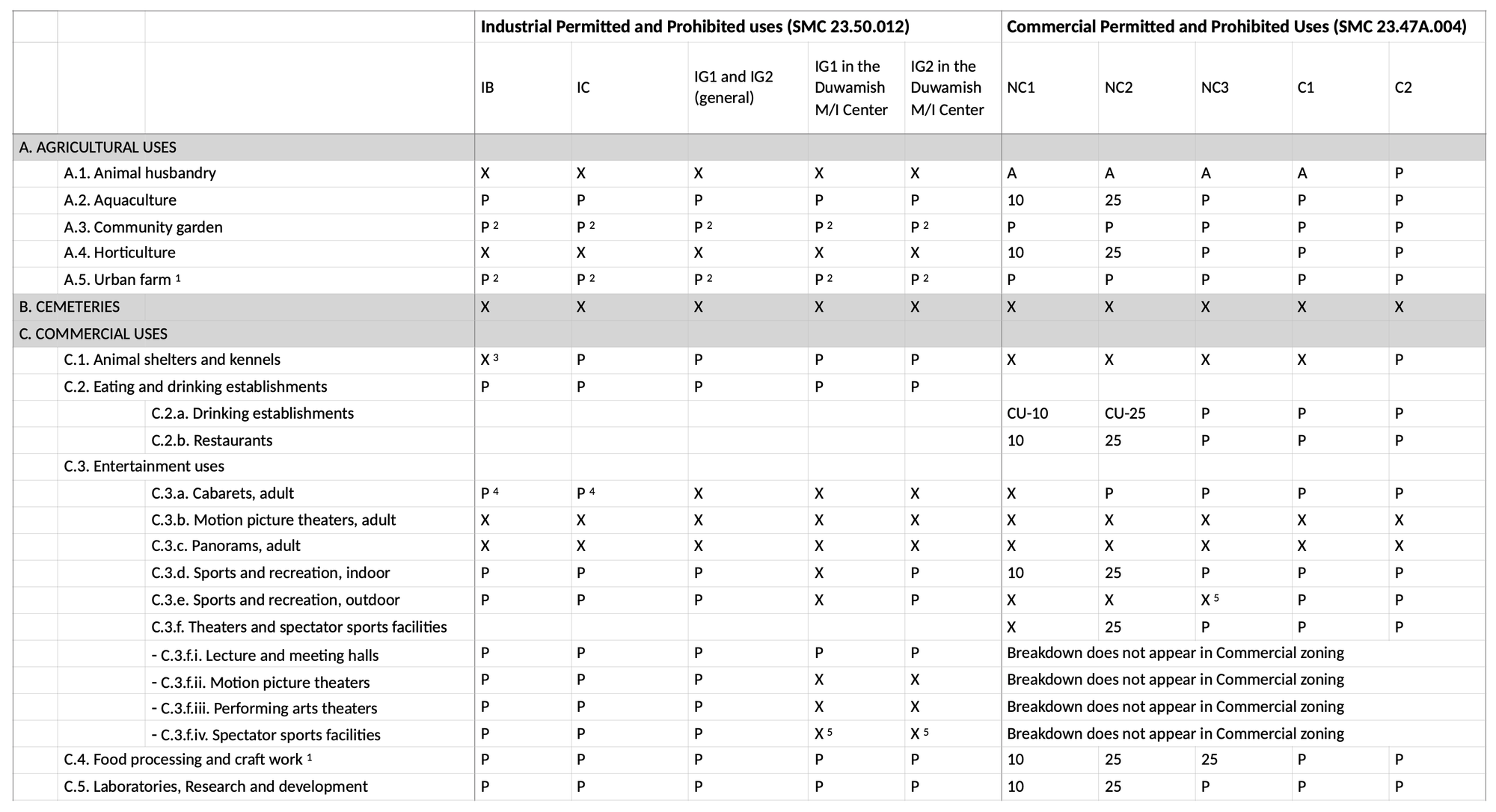 And here is a taste of the use table for Seattle’s industrial and commercial zones. The entire combined grid is linked here and also attached at the bottom of this article for your perusal.